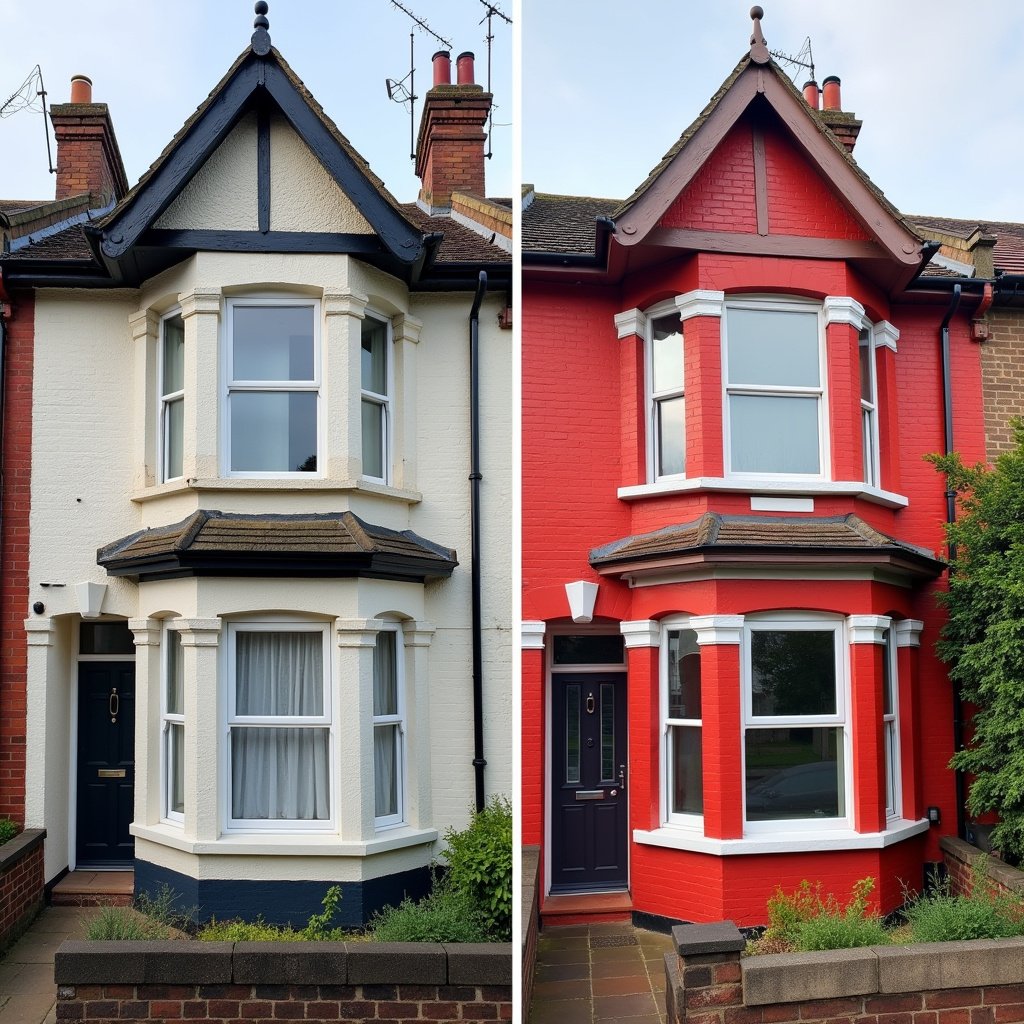 A section of a wall is being painted. The surface appears partially covered with paint, and various painting supplies are present, including a large paint bucket and a brush. The ground is protected with plastic sheets, and there is a close-up of paint on a tool in the foreground.